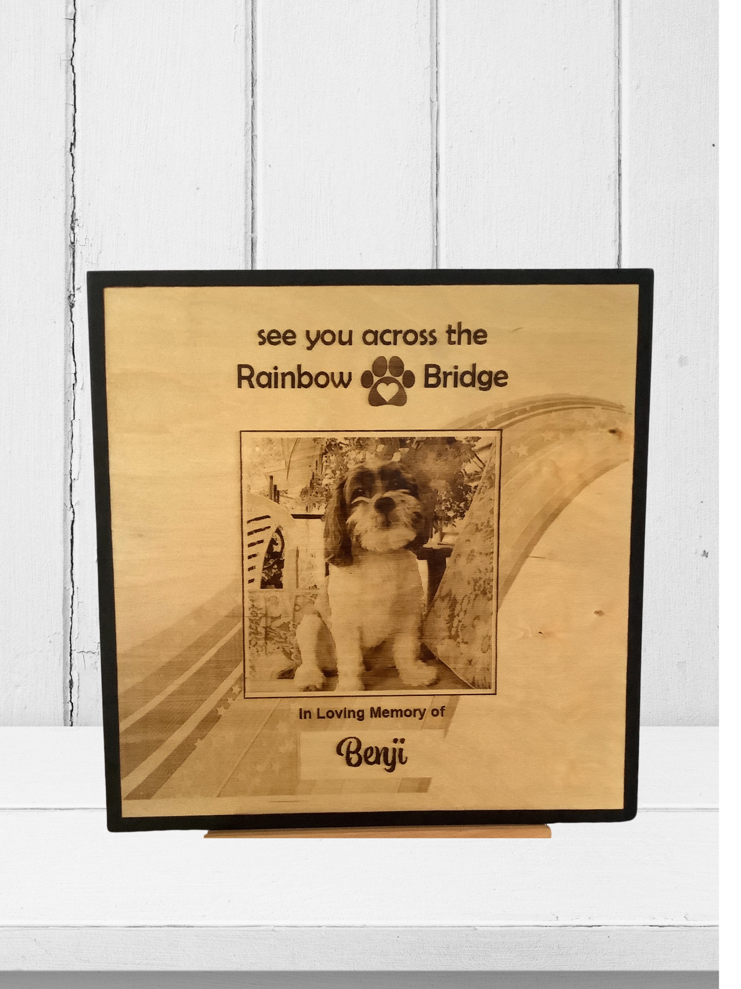 More than a memory, a masterpiece: Introducing Burnt Creation's Wood Burnt Personalized Creation for Pets that have passed over the Rainbow Bridge.